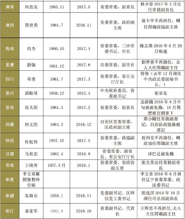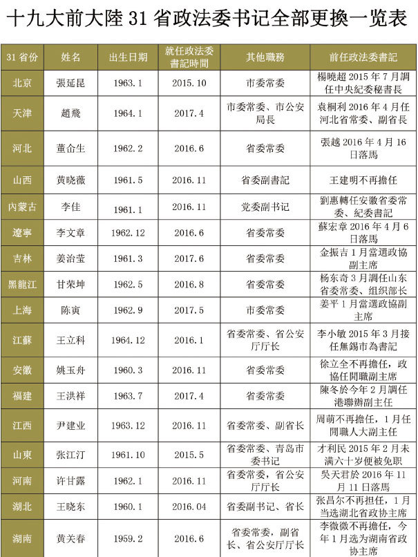 中共19大換屆未到,大陸31省分的政法委書記已經全部換人。