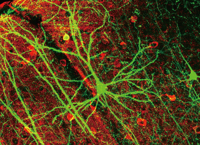 利用染色方法,在顯微鏡下觀察局部大腦的神經細胞分布情況,可見細胞之間的組織結構極其細密複雜。(維基百科)