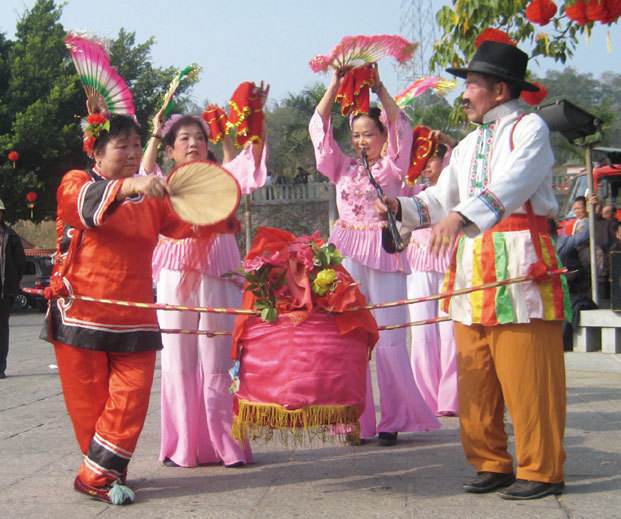 〈車鼓舞〉是郭芝苑回憶兒時廟會祭典所寫成的舞曲。圖為閩南同安文車鼓表演。(伊藍/維基百科)