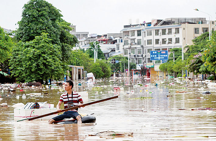 洪災導致11省共56人死亡、22人失蹤,經濟損失250億元人民幣。圖為7月3日廣西柳州水患。(AFP)