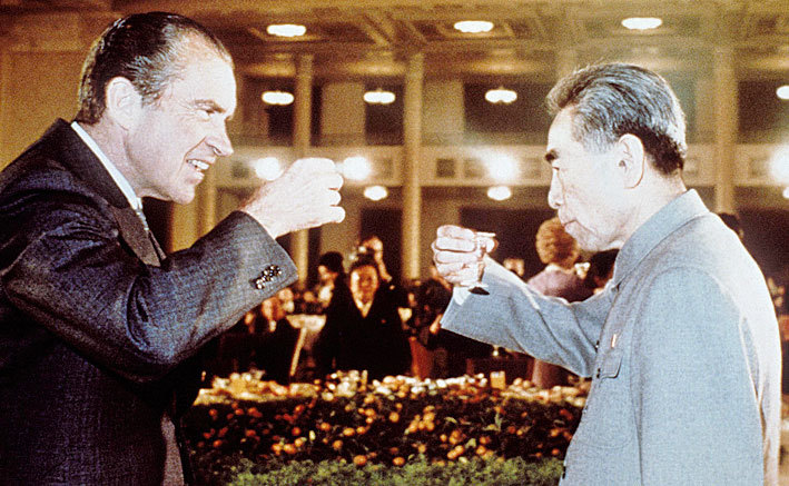 由於周恩來(右)的個人嗜好,茅台成為酒桌政治學中的最高液體。周恩來用茅台款待基辛格、尼克森(左)和田中角榮的照片,成為茅台外交的證據。(AFP)