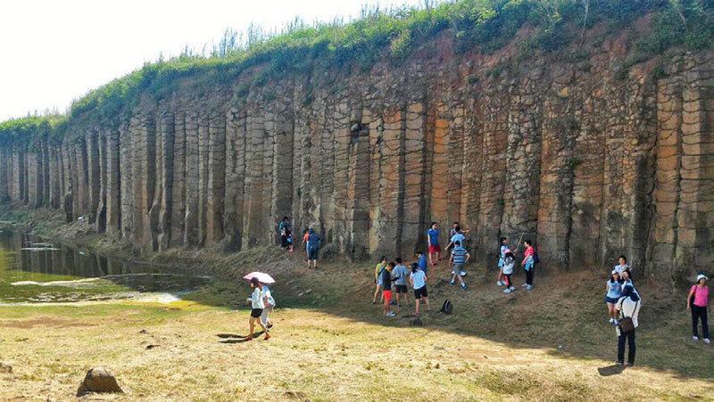 澎湖西嶼濱海公路上有座壯觀的「大菓葉柱狀玄武岩」,日治時期為了開發馬公與西嶼間的海上交通,在大菓葉海邊闢建碼頭,挖土造港時意外地發掘出這片埋於土中、沉睡千年的壯麗柱狀玄武岩。千萬年前的岩石熔流,變成了如今的五、六角的柱狀節理,每當大雨過後,前方低漥地積水倒映出壯觀的玄武岩,那海天一線的延伸倒影唯美得像幅畫。