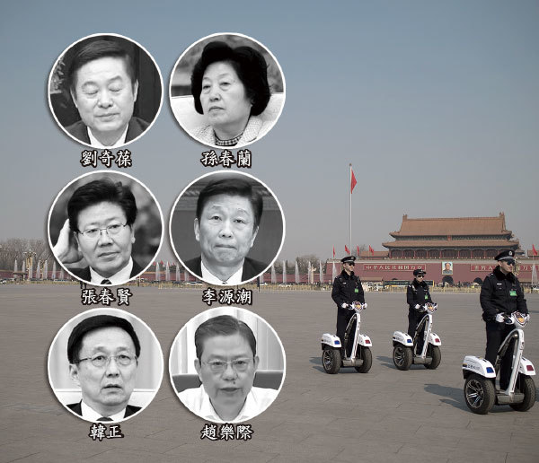 習當局推出「能上能下」制度及「問責條例」等,為拿下江派官員制定「籠子」。劉奇葆、張春賢、韓正、孫春蘭、李源潮、趙樂際六人近年來均傳出不利消息。(新紀元合成圖)