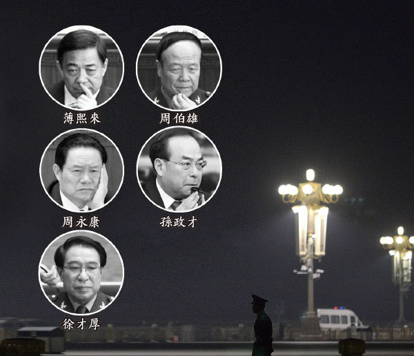 18大前後至今,胡錦濤、習近平已聯手接力拿下政治局委員、重慶書記薄熙來、前政治局常委、政法委書記周永康、前政治局委員、軍委副主席徐才厚與郭伯雄、政治局委員、重慶書記孫政才。