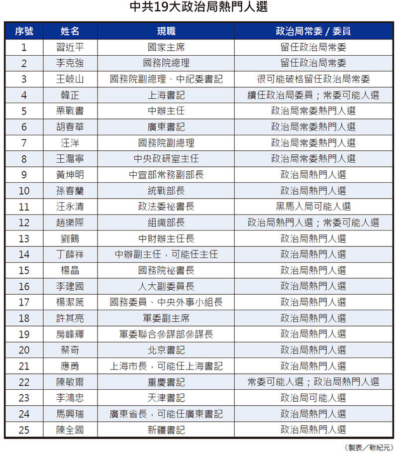 盤點19大政治局可能名單