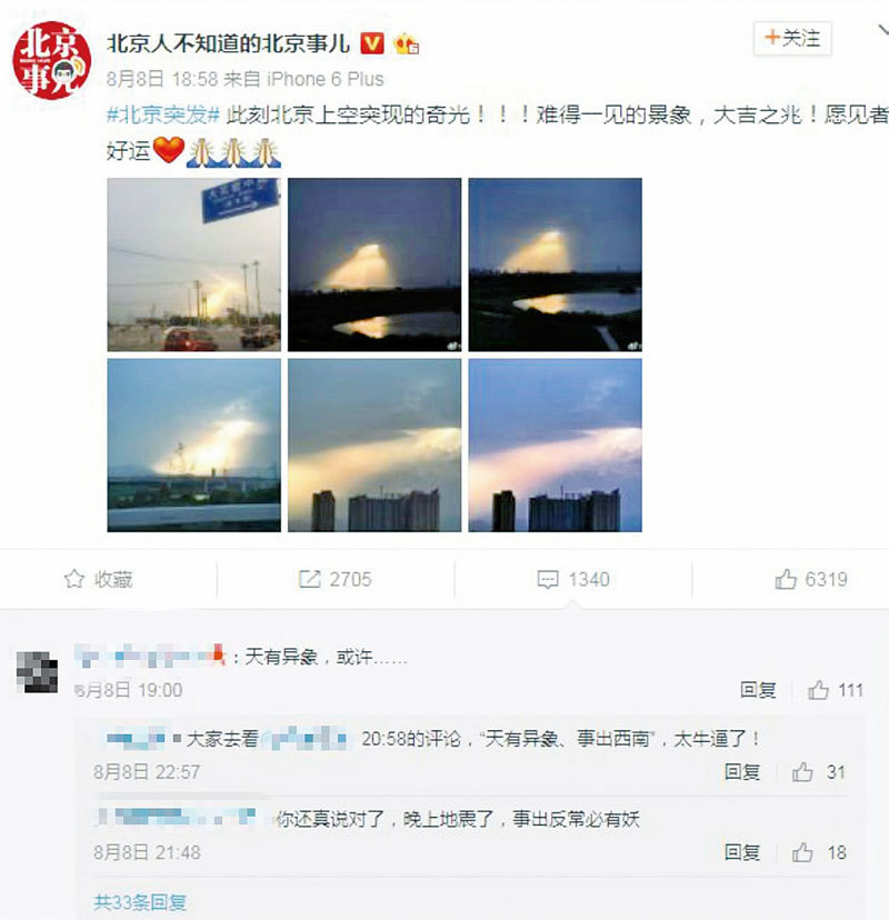 8月8日九寨溝震前2小時(晚7點多),網民「北京人不知道的北京事兒」發了一組北京上空突現的奇光照片。晚8時58分網民「蝦在江湖」跟帖稱「天有異象,事出西南。」