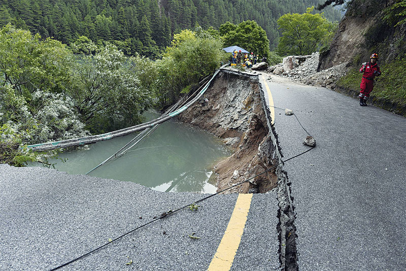 8月10日,九寨溝地震造成的路面嚴重損害,仍未修復。(AFP)