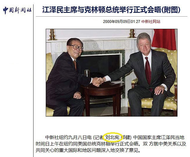 劉北憲的仕途發跡與江澤民有關。圖為2000年9月,劉以中新社記者身分隨江澤民訪聯合國,對江進行美化報導。回國後,劉立即升職為中新社常務副社長兼副總編輯。(網頁截圖)