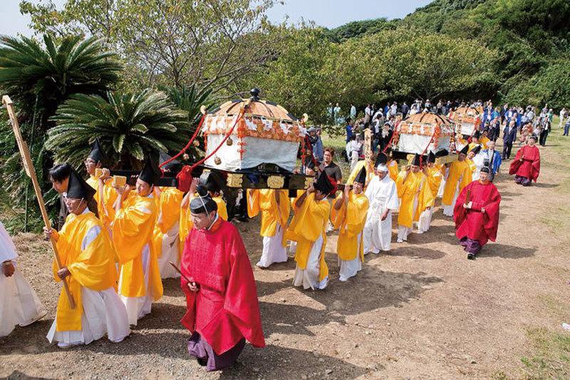 日本「神宿之島」位於距離九州島本土約60公里處。據《日本書紀》記載,該島的宗像大社沖津宮是海之女神坐鎮之處。在四至九世紀期間,為了祈願日本本土與朝鮮及中國之間的海路安全,曾經在此處舉行大規模的國家祭祀活動,大量來自海外的珍寶作為祭祀品被埋入地下。二戰之後,這裡出土了銅鏡、黃金戒指、朝鮮半島的馬具、通過絲綢之路運來的玻璃製品等共計8萬件供奉品,全部被定為國寶。
