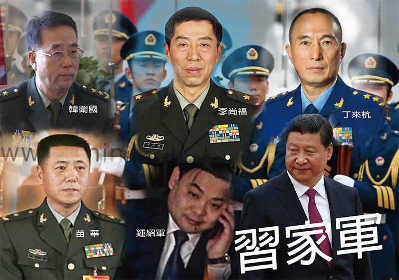 近期,北京流傳軍方高層即將異動,升遷的多名將領中,韓衛國、苗華、李尚福、丁來杭和鍾紹軍被指是習家軍。(新紀元合成圖)