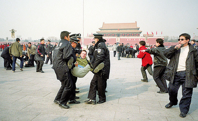 2002年2月14日法輪功學員在北京天安門廣場遭大批警察非法抓捕。(AFP)
