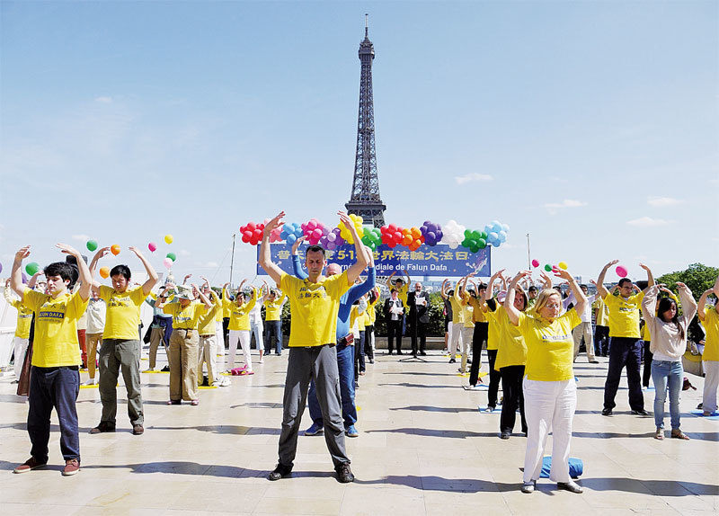 法國是法輪功來到西方的第一站,圖為法輪功學員在埃菲爾鐵塔前煉功。(大紀元)