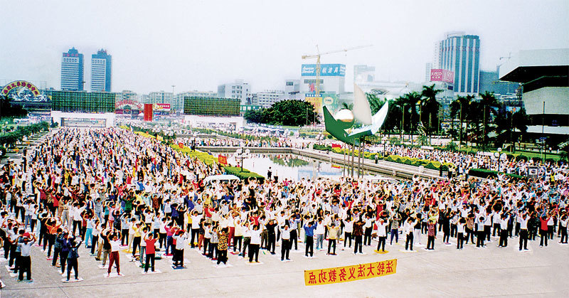 1998年廣州的一個法輪功煉功點的學員們在晨煉。(明慧網)