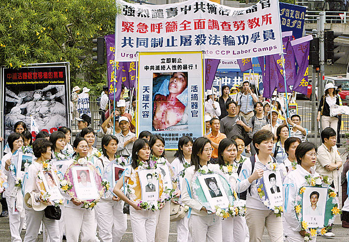 2006年4月29日香港法輪功學員呼籲制止中共活體摘取法輪功學員器官。(AFP)