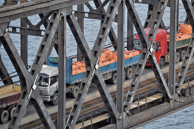 中共控制北韓核試驗的關鍵原料和技術人員,甚至有些實驗都是在中國核基地祕密完成。圖為大卡車正通過丹東大橋將貨物運往北韓。(AFP)