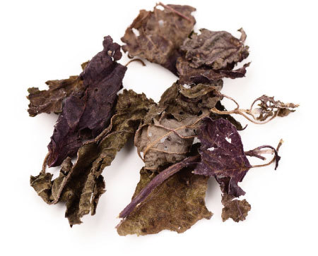 紫蘇為唇形科一年生草本植物,性味辛甘溫,歸肺脾經。紫蘇葉紫而背白,另一種葉綠而背白稱白蘇。《本草綱目》說:「蘇從穌,音酥,舒暢也。蘇性舒暢,行氣和血,故謂之蘇。」以其氣味辛入氣分,能定喘下氣消痰;色紫入血分,能和血止痛、安胎;香溫能散寒袪風。