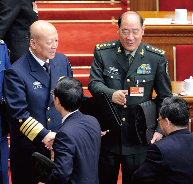中共前海軍司令吳勝利(左)9月1日傳出正接受調查。圖為2011年中共兩會上,圖右為已落馬的前中共總政治部主任李繼耐。(AFP)