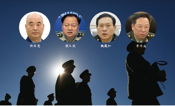 19大上,中央軍委有可能由原來的兩名副主席增至四名副主席:許其亮、張又俠、魏鳳和、李作成;不再設軍委委員。(新紀元合成圖)
