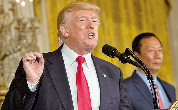 美國總統川普與鴻海董事長郭台銘(右)7月26日在白宮宣布富士康將在美國威斯康辛州投資100億美元。(AFP)