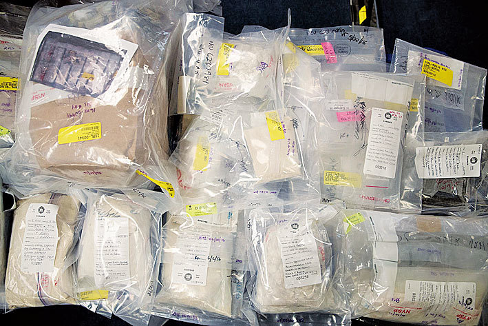 美前緝毒員說合成毒品的更新速度非常快,如一種物質被列管,中國製造商會製造出不在列管範圍的新物質。圖為2016年紐約警察局截獲的大量毒品。(Getty Images)