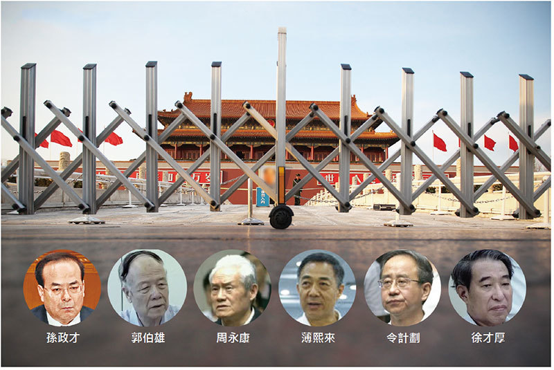 9月25日,周永康、薄熙來、郭伯雄、徐才厚、令計劃、孫政才六人被同框出鏡,江派政變集團擴展為「六人幫」。(新紀元合成圖)