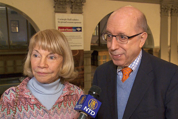 前電視新聞女主播Kristi Witker與友人Bob Kandel於10月14日晚在紐約卡內基音樂廳欣賞了神韻交響樂團的演出。(新唐人電視臺)