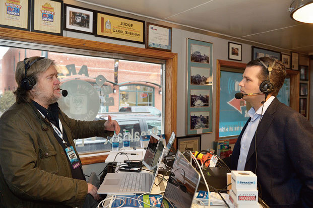 離開白宮後,班農回去執掌右翼新聞網站布萊特巴特新聞網(Breitbart News),圖為2016年2月8日,班農採訪川普長子。(Getty Images)