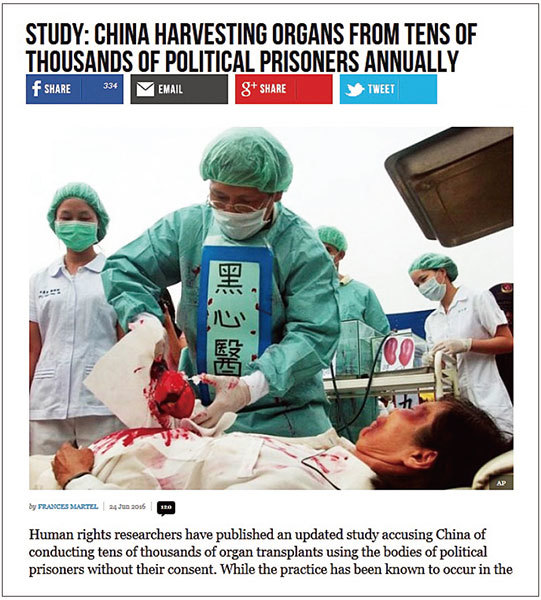 2017年8月28日,布萊特巴特新聞網在一篇針對中共《環球時報》盛讚中共器官移植公平分配制度表示質疑的文章中,配的兩幅圖為法輪功學員模擬中共強摘器官的圖片,其用意不言而喻。此外,在布萊特巴特新聞網的其他文章中,亦有提到法輪功學員被迫害的情況。