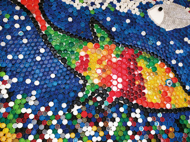 合橫國小師生淨灘,利用棄廢瓶蓋布置校園。