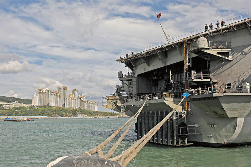 美國總統川普出訪亞洲前,美國海軍三艘航母已進入朝鮮半島海域,對北韓和中共都是極大的威懾。圖為10月21日美國里根號航母停泊韓國釜山海軍基地。(Getty Images)