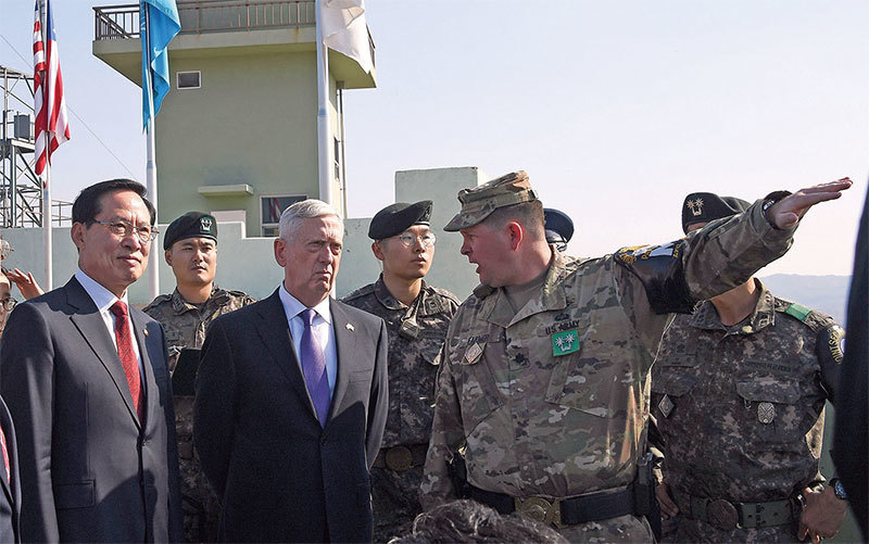 CBS新聞報導,馬蒂斯在視察板門店(Panmunjom)「休戰村」(truce village)、非軍事區(Demilitarized Zone)內的一個軍事觀察站,以及對美韓部隊講話時,都提到了外交才是終結北韓核武危機的答案,而不是戰爭。