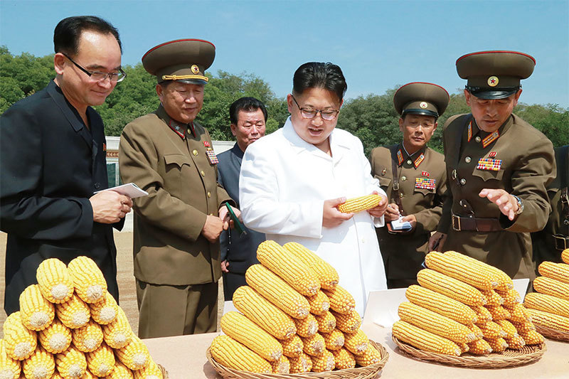 玉米是北韓的主食,因為長期以來食物只有玉米,很多人患了一種叫「眼睛病」的怪病,其脖頸和眼睛周圍會長出閃閃發亮的疹子。圖為金正恩樣板照。(AFP)