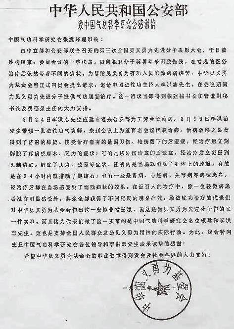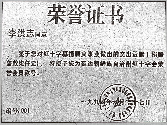 李洪志先生幾次將氣功報告的有限收入捐獻給中華見義勇為基金會、圖書館或紅十字會。圖左為公安部頒發的感謝信,右為延邊紅十字會頒發的榮譽證書。(明慧網) 20多年來,各地參加過李洪志先生講法班的法輪功學員寫了不少回憶文章。