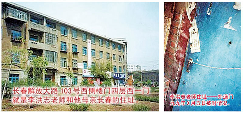 中共誣蔑李洪志先生在中國長春住豪宅,圖為李先生在長春的住處外觀和被貼上封條的門。(明慧網)