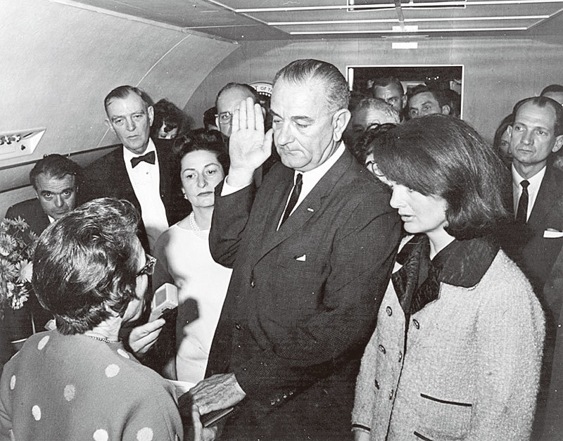 甘迺迪去世後兩小時內,同行但不同車的副總統林登.約翰遜回到空軍一號總統座機上,宣誓就職美國第36任總統。約翰遜身邊的傑奎琳還穿著沾滿丈夫鮮血的那件外套。(Getty Images)