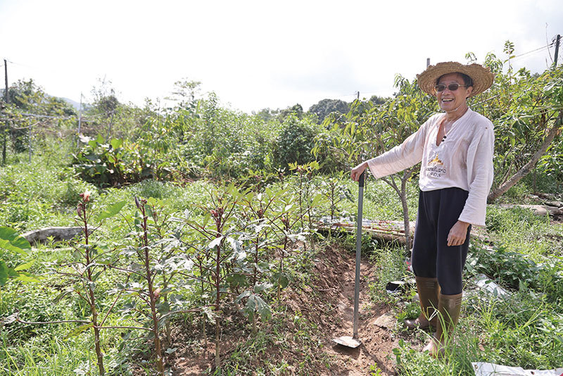 環顧四周,與通常整整齊齊種滿一兩種農作物的農田不同,劉達文田中的「生物多樣性」,竟有幾十種。他帶著滿意的微笑,指點他辛勤耕耘的成果:架子上是絲瓜;架子下面種著幾棵洛神花,酸酸的,用來煲水喝;一旁的人參果剛剛長到花生大小;土壤裡埋著芋頭和蕃薯;田邊高高的立著大樹菠蘿和番鬼荔枝樹;靠近小屋的一邊生長著艾草,可以煲糖水;還有木蓮、鳳眼果等等,都各自盎然生長。