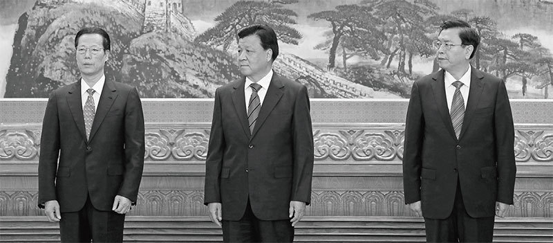 中共十八屆三常委張德江(右)、劉雲山(中)、張高麗(左)是江澤民集團對抗習近平的前臺人物。(Getty Images)