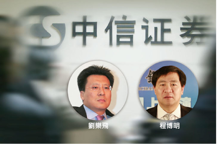 中信證券在大陸2015年股災後,有十多名高管被當局調查,其中被判刑三年半的前總經理程博明是中共江派前常委劉雲山的兒子、中信證券實權人物劉樂飛的「手下大將」。(新紀元合成圖)