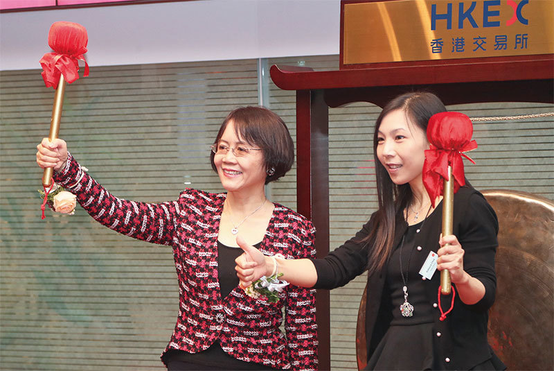 胡舒立(左)與財新起到了在輿論界為習王打「虎」造勢的作用。圖為10月24日胡舒立旗下兩隻ETF在港上市。(余鋼/大紀元)