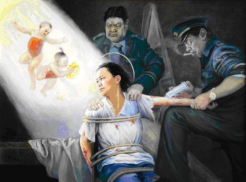 在中共的勞教所裡,警察給法輪功學員注射迫害中樞神經的毒針。圖為真善忍美展作品〈光明與黑暗〉。(明慧網)