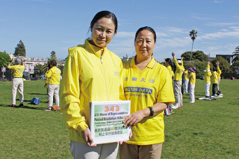 在舊金山沈越千(左)手持2016年6月13日,美國國會眾議院一致通過343號決議案,要求中共立即停止針對法輪功學員等良心犯的「強摘器官」行為信息的小展板。(大紀元)