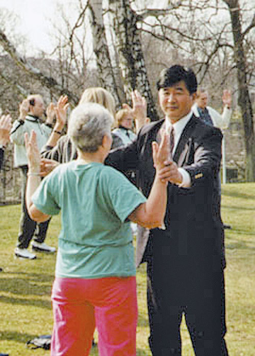 1995年4月瑞典哥德堡舉辦講法班期間,李洪志先生親自教功。(明慧網)
