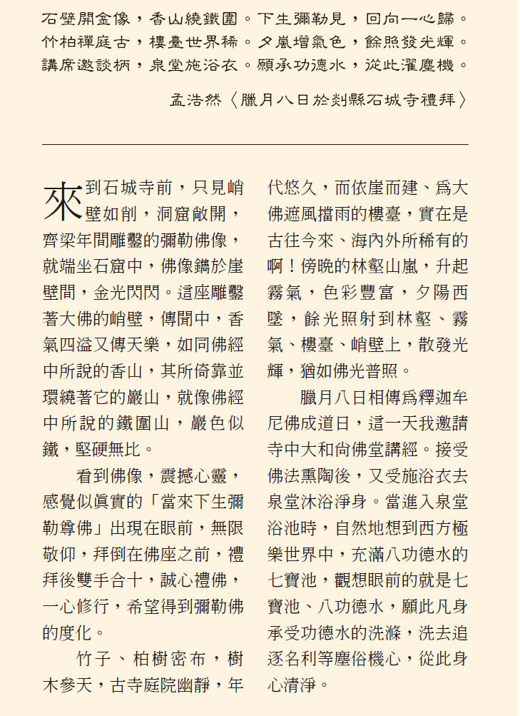 回顧了石城寺的石雕彌勒大佛的歷史淵源,可以更深切地理解孟浩然的詩作〈石城寺禮拜〉。
