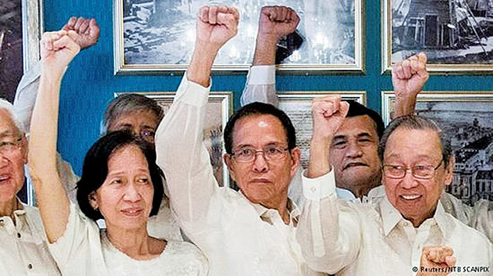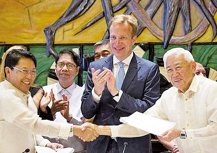 2016年8月26日,菲律賓政府代表團杜雷薩(左)和菲共全國民主陣線賈蘭多尼在挪威奧斯陸簽署停火協議。挪威外交大臣博爾格.布倫德(中)鼓掌祝賀。(新華/美聯)
