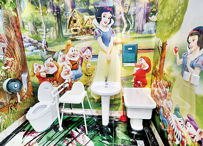 「廁所革命」讓中國出現各式各樣的公廁,甚至有「五星級」公廁。圖為江蘇南通市一公共廁所內彩繪的景觀。(Getty Images)