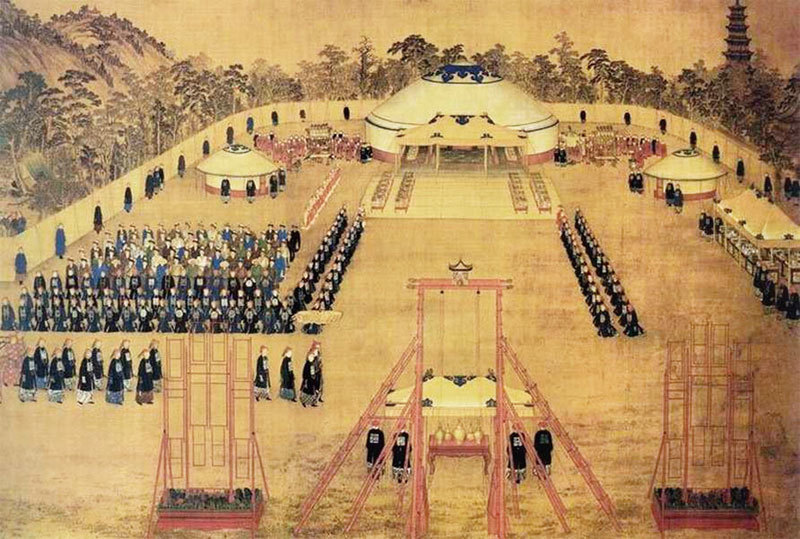 清朝郎世寧、王致誠等作〈萬樹園賜宴圖〉,描繪乾隆帝於避暑山莊萬樹園宴請杜爾伯特部首領的場面。(公有領域)