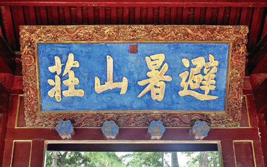 山莊內午門上康熙帝御筆避暑山莊匾額,匾額上的「避」字,「辛」字旁多一橫。(頤園新居/維基百科)