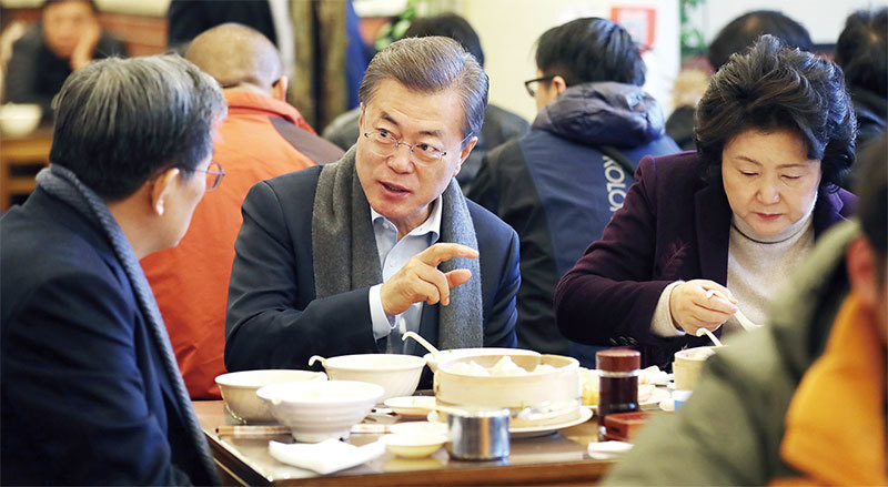 雖然是國事訪問,中共對來訪韓國總統的待遇很低,圖為12月14日到訪的韓國總統文在寅夫婦,無中方人員陪同,在一早餐店享用油條、豆漿等。(大紀元資料室)