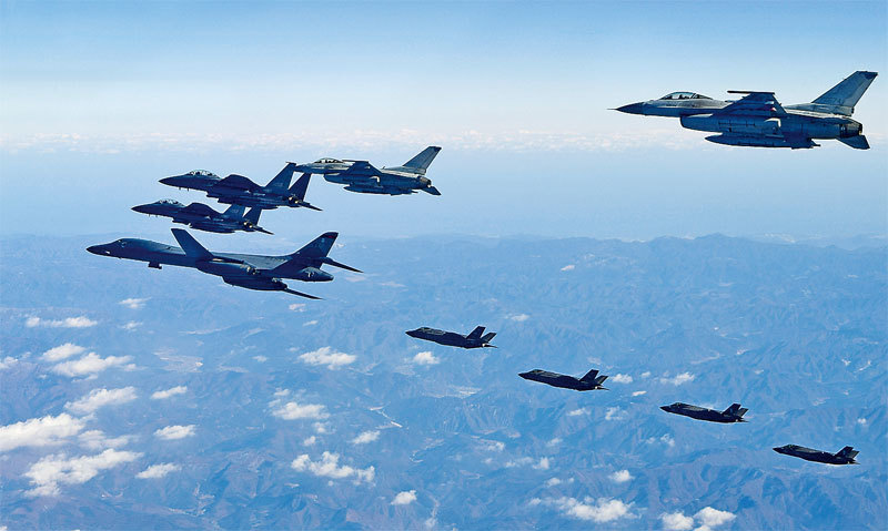12月6日,美、韓空軍史上最大規模「警戒王牌」聯合軍演中,美國空軍B-1B轟炸機飛越朝鮮半島。(Getty Images)