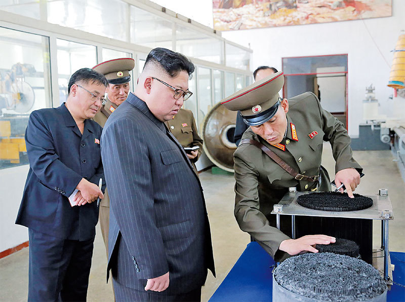 有消息稱,北韓正模擬測試炭疽菌搭載在彈道導彈的能力,假如成功,全球將面對生化危機。圖為金正恩(中)在一個祕密地點訪問國防科學院化學材料研究所。(Getty Images)